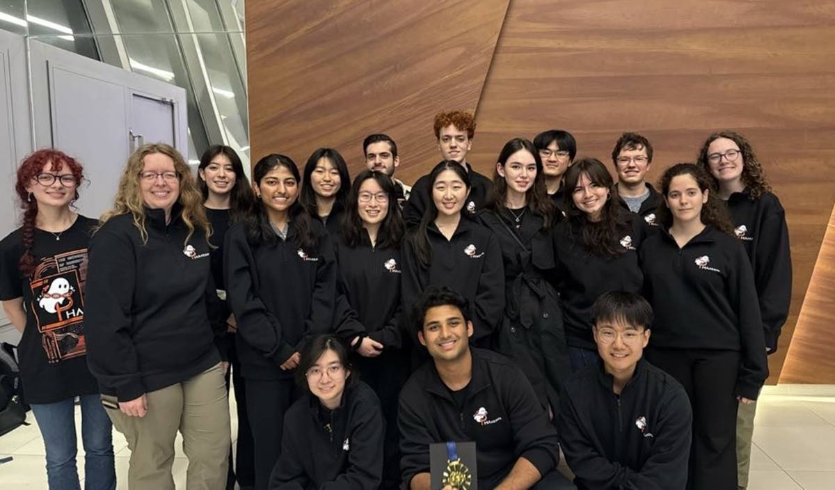 Pictured below: Team PHAntom, including teaching assistants (TAs) and Dr. Meyer, posing with their gold medal. Back row (left to right): Anthony Renzi (TA), Owen Oxley (‘27), Yifeng (Jackson) Zhao (‘26), Zack Vanderhoff (TA), Elizabeth Martin (TA). Middle row (left to right): Lacie Low (TA), Dr. Anne Meyer (advisor), Cassidy Garibaldo (‘27), Shailey Guddeti (‘26), Victoria Wang (‘27), Clare Liu (‘27), Hannah Lee (‘27), Sevarakhon Umarova (‘28), Sophie Black (‘27), Maia Kurti (‘27). Front row (left to right): Jessica Wang (‘28), Soham Bandyopadhyay (‘26), Daniel Oh (‘26). Not